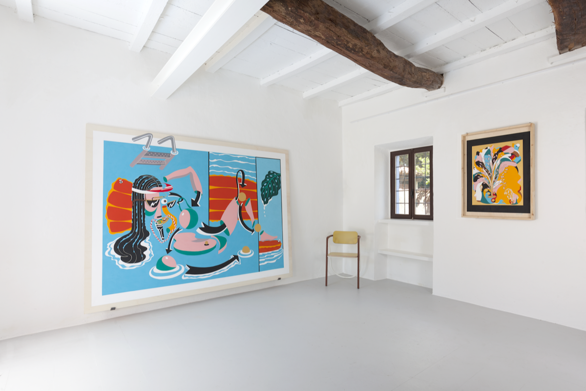 A parete, da sinistra: Woman in the pool, acrilico su tavola, 187x252 cm. Fed by sorrow will bloom again, 2020. Acrilico su pannello, 100x70 cm.