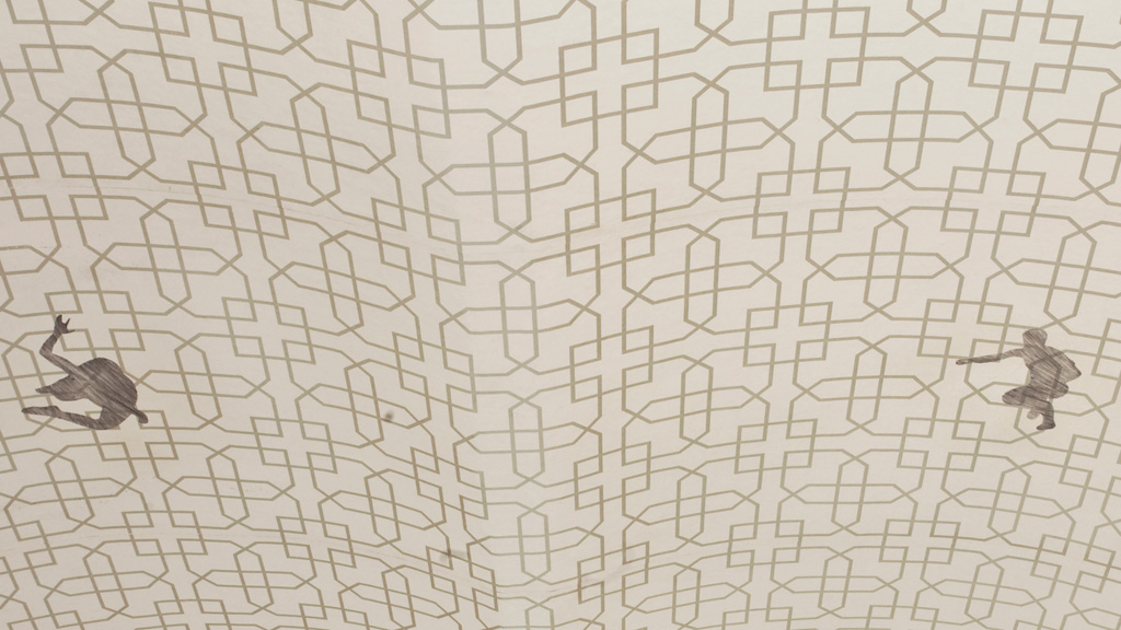 Intervento site specific di Donatella Spaziani, con disegni su carta da parati applicata a soffitto, commissionato per un'abitazione milanese.